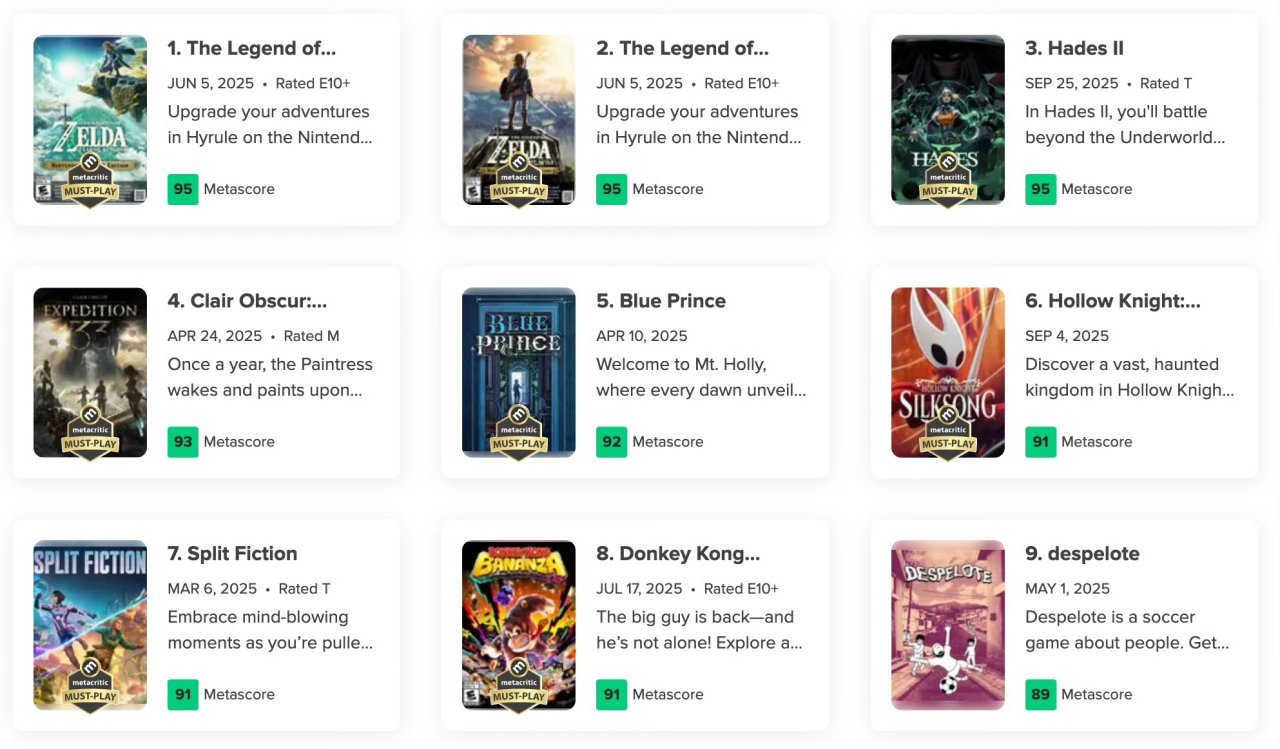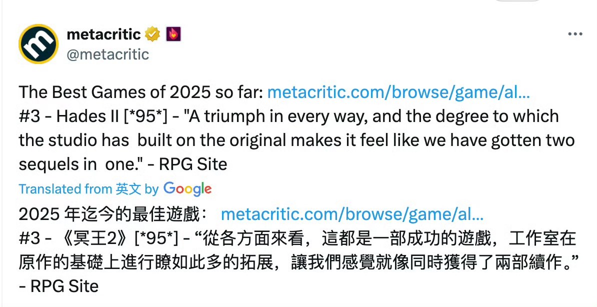 M站官方最新榜单显示,《哈迪斯2》凭借95分的媒体均分,成为2025年迄今评分最高的新游戏,该分数与NS2版《塞尔达传说:旷野之息》《塞尔达传说:王国之泪》持平,跻身“神作梯队”。