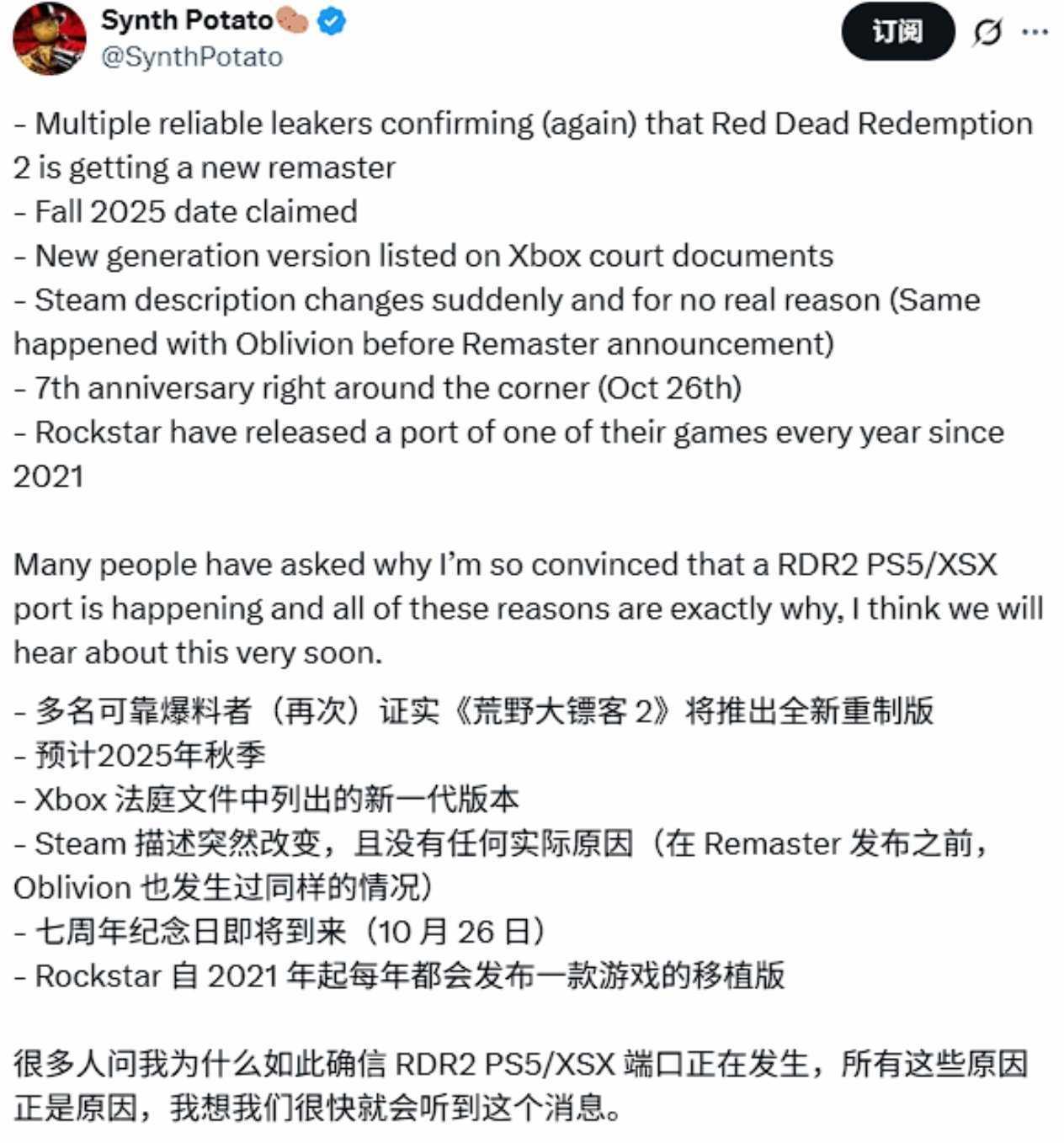 随着《荒野大镖客2》发售七周年纪念日(10月26日)临近,关于游戏将获次世代升级的传闻再次升温。知名爆料人NateTheHate近日确认,《荒野大镖客2》的次世代增强补丁及Switch 2移植版已在开发中。