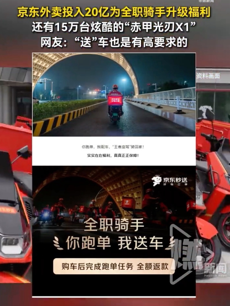京东外卖则直接投入20亿元为全职骑手升级福利,包括五险一金、防寒暑补贴,以及15万辆二轮车。