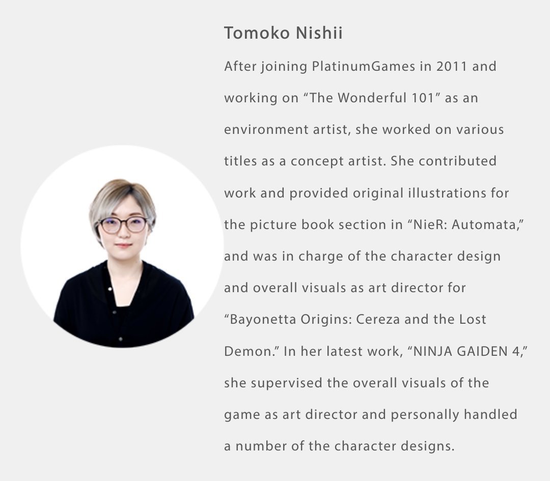 西井智子是白金工作室的资深艺术总监,她的设计风格以细腻的角色建模和动态概念艺术闻名。