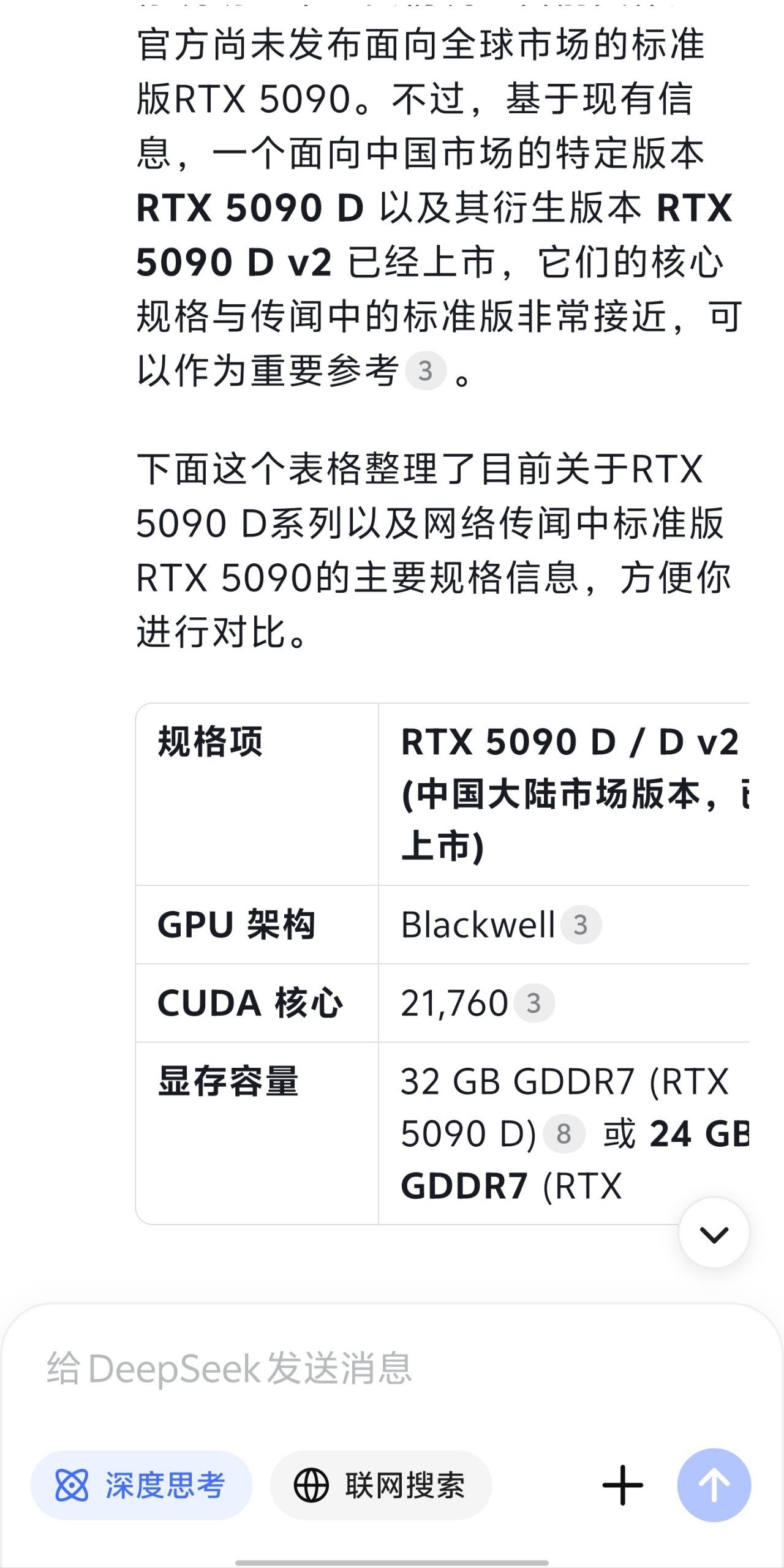 大家都知道AI,聰明就在於數據收集和整理,可一旦信息過時,AI可能就無法給出合理的建議和推薦,甚至可能誤導你,就比如說5090的規格你現在去問deep seek無論是深度思考還是聯網搜索模式,他都會告訴你這是一款未上市的顯卡,只有聯網搜索模式能給你那時的預測數據