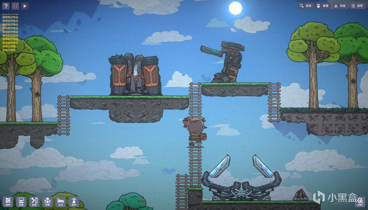 基于浮岛背景,清理完散乱的碎石后,游戏允许铺设装饰、地形(地基)、梯子和设施,几乎做到了高自由度建造。
