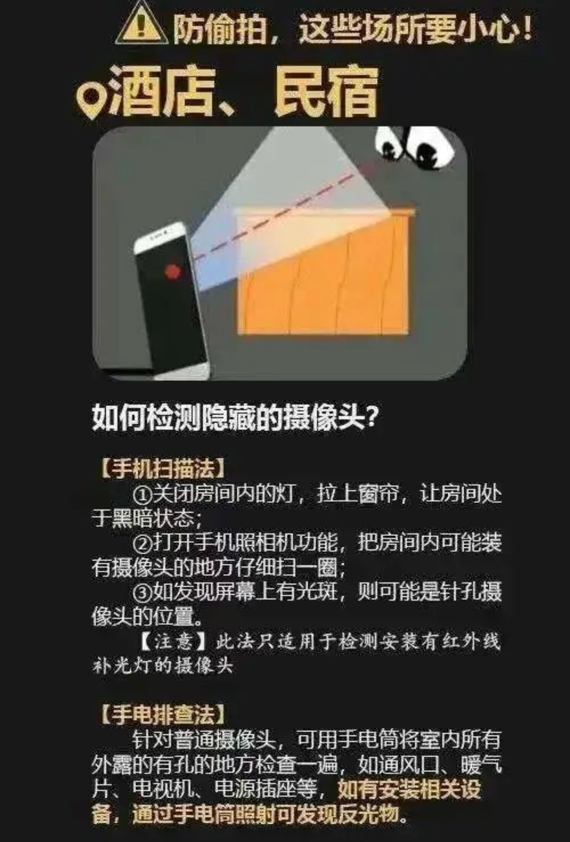 6、在酒店入住的时候先检查一遍有没有监控设备,角角落落都检查一遍,尤其是面对床的一些开关、灯罩等地方,关上灯,看看有没有小红点。另外,酒店里的毛巾、水壶等非一次性用品不要使用。