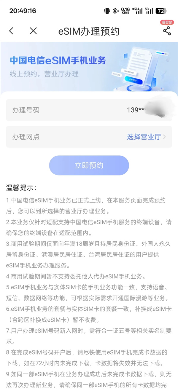 预约页面显示,中国电信eSIM手机业务已正式上线,完成预约后可到所选择的营业厅办理业务。