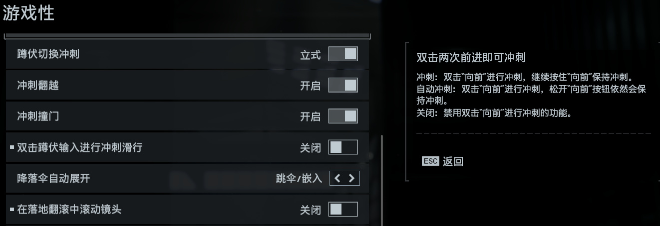 双击蹲伏滑行关闭!这样冲刺的时候只要按一次蹲(Ctrl/C)就可以滑行