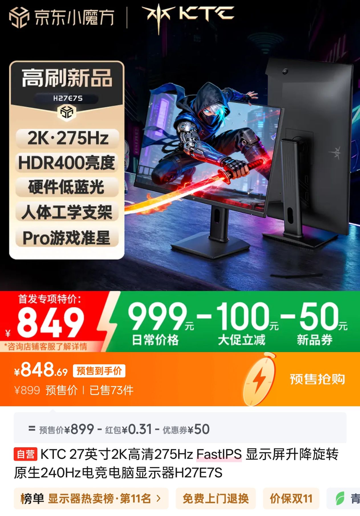 要知道618期间,H27E7因为国补的存在,到手价才800元不到,这会你双11搞一个降级款收我849,说不过去吧难不成因为请了茄子做代言人,你跟茄子一起飘了?