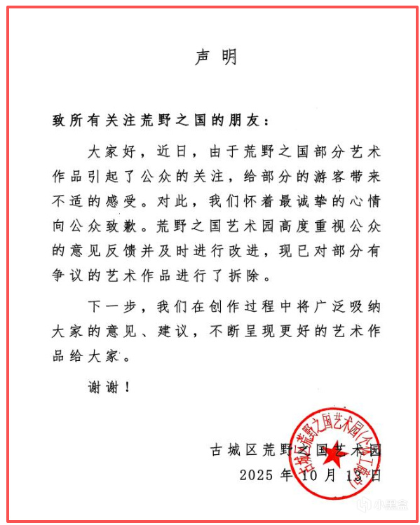 不過在輿論發酵後,10 月 13 日 “荒野之國” 藝術園發佈聲明,對部分作品引發公衆關注、給遊客帶來不適表達誠摯歉意。同時表示高度重視公衆意見,已對有爭議的藝術作品進行拆除,後續會更注重作品與大衆審美的契合度。