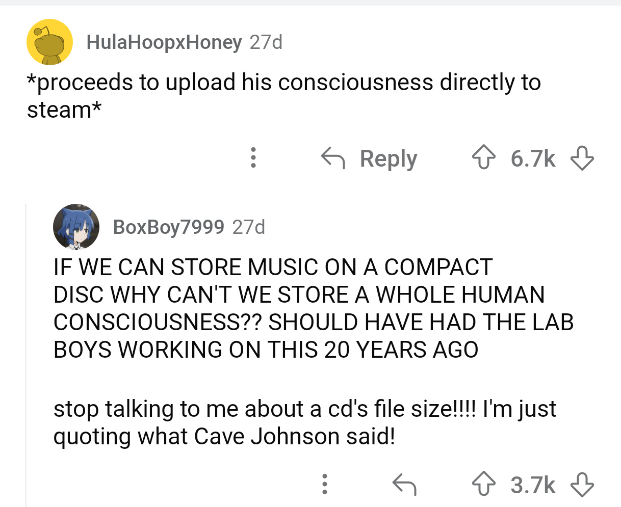 「既然音乐能塞进光盘,凭什么不能把整个人类意识也塞进去?!实验室那帮人20年前就该搞这项目了!别跟我扯什么光盘容量不够!!!我这是在引用Cave Johnson的原话!」