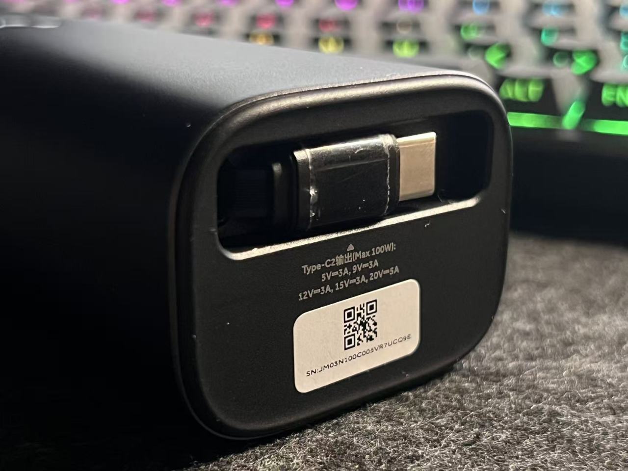 底部自帶一根可伸縮的C口數據線,長度約60cm,同樣支持多種規格功率輸出,最大100w,支持自充補能,搭配65w快充頭補能約2小時補滿,這60cm長的伸縮線平常出門放在包裏需要時抽出充電還是很方便的。