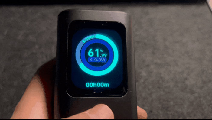 正面的大面積TFT彩屏通過下方按鈕點亮,默認是以電量環形式顯示充電寶剩餘電量,下方是具體可用時間,中間是充電動畫和充電功率;通過短按還能查看充電具體參數,比如本次充電時間充電寶剩餘電量最大電池容量循環次數電池溫度充電寶輸出總電量;短按和長按還能調整屏幕亮度、亮屏時間和語言切換。