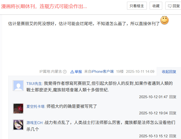 但是读者粉丝们还是倾向于认为,芙莉莲休刊虽然有两位作者(山田负责故事,阿部司负责作画)身体的原因,但绝对也有【没活了,不知道该怎么编下去了】的因素。