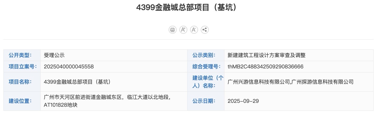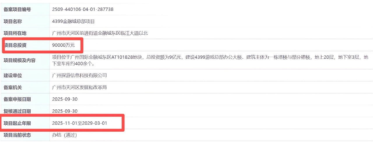 根據備案信息,4399金融城總部項目總投資高達9億元,計劃在2025年11月1日正式動工,預計2029年3月1日竣工,建設週期超過3年。