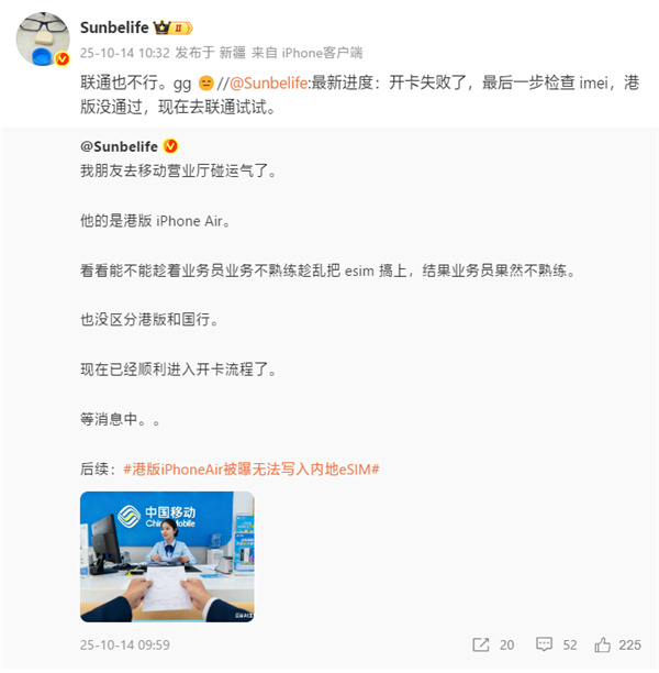 据博主Sunbelife透露,他朋友拿着港版iPhone Air去中国移动和中国联通的营业厅尝试开卡,全部失败。