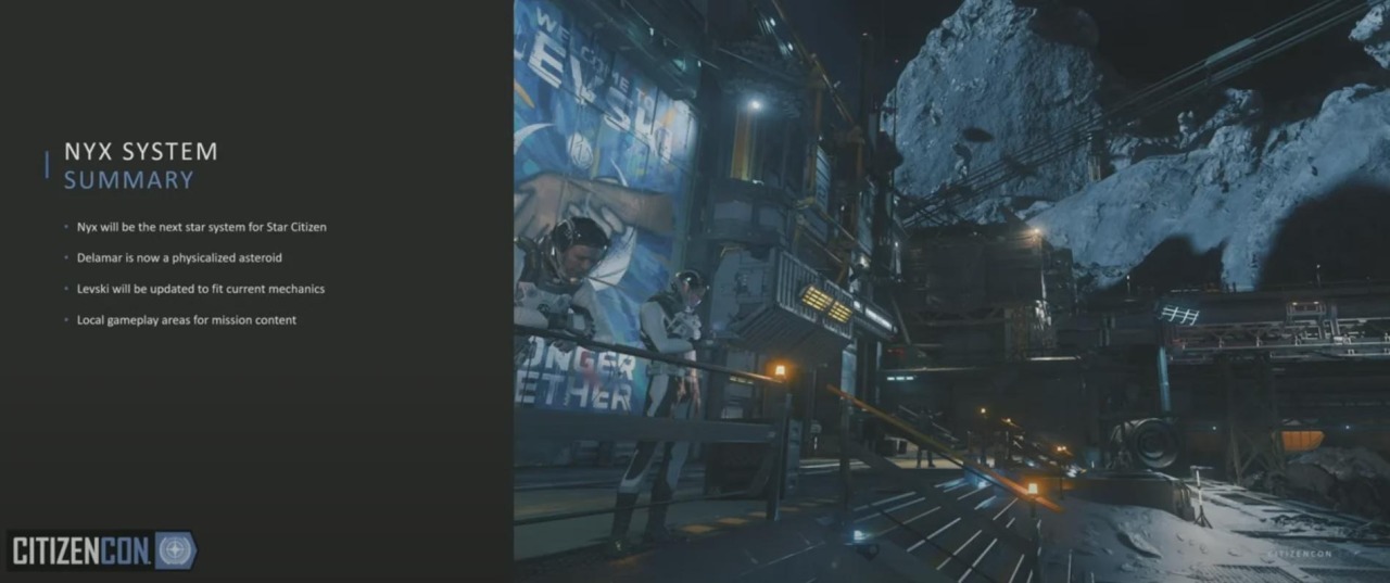 根據CIG設定的背景故事,Nyx最初因被帝國認爲不適合星球改造/採礦而遭忽視,隨後成爲革命組織"人民聯盟"的避難所。其主要前哨站"列夫基(Levki)"融合了邊疆精神與在UEE監管外求存的掙扎。該站現以全面升級的可探索社交經濟中心形態迴歸:優化內部結構、新增艙外活動通道、貨物操作區、精煉廠、仁慈醫院((the Mercy))、新市場與商鋪(飛船配件店"教師"、護甲店"科迪斯"(Cordies for armor)、武器店"良心物品"(Conscientious Objects for weapons)及社交區"繆斯咖啡館"(Cafe Muse),並實現顯著視覺提升。探索列夫基時,玩家將目睹象徵反抗壓迫性梅瑟政權的標誌性安東尼·田中雕像。