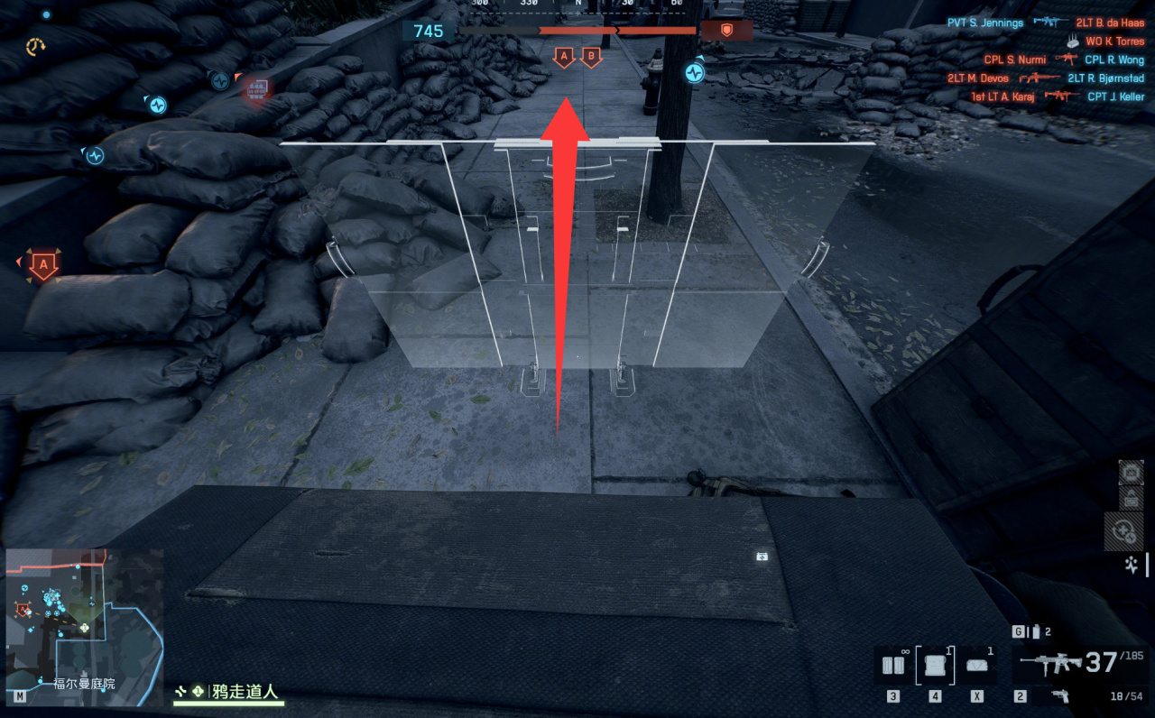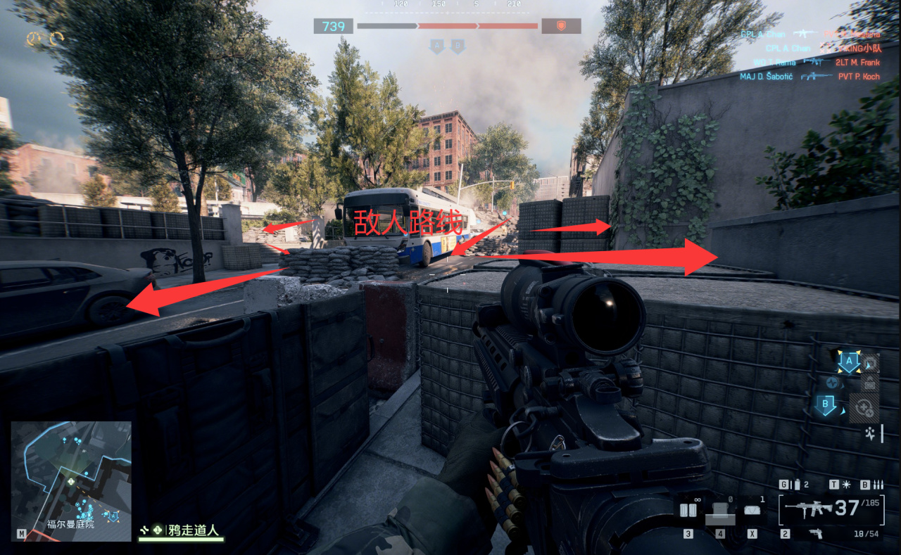 接下来我们将会以防守方开始刷人机,按照我如图所示的顺序一路跑到最后的地方待着。