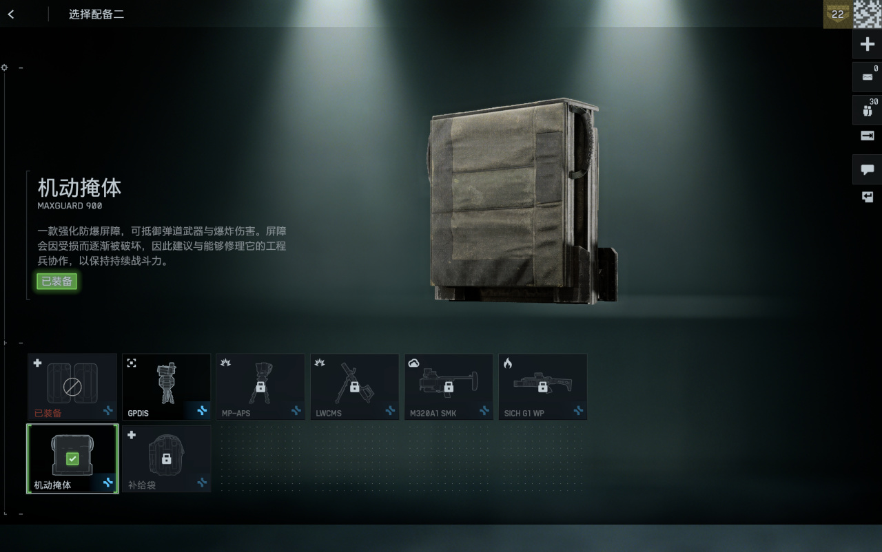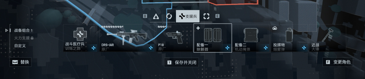 首先我们需要把自己的兵种换成支援,因为支援能够有着无限子弹补给的子弹袋保证我们持续的续航,然后另外两个技能其中一个必须带档板,因为档板使我们安全保障最核心的一个点,另一个随便带就行,带反手雷也可以但是概率拉到后方敌人AI的仇恨略微有一些风险。