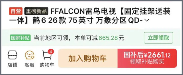 遼寧青海地區,京東(雷鳥鶴6 26款 75英寸)活動售價4158元(其它地區自測)下單領取滿1000打8折優惠券,國家補貼20%,下單1件,實付低至2661.12元。