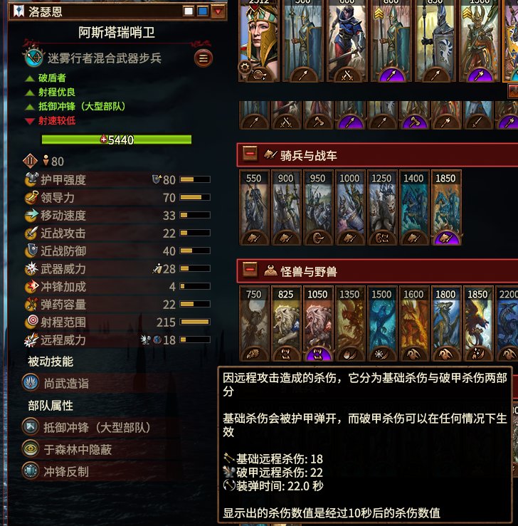比如还是高精牢头的特色迷雾系列兵种:阿斯塔瑞哨卫。面板远程威力显示的总数值只有可怜的18点,但实际数值却是18不破和22破的面板,所以每一轮射击造成的伤害其实很高,总数值低单纯只是因为他基础射速太慢了,需要整整22s的装弹,所以平均10s内的杀伤数值才会显示远程威力只有18点。