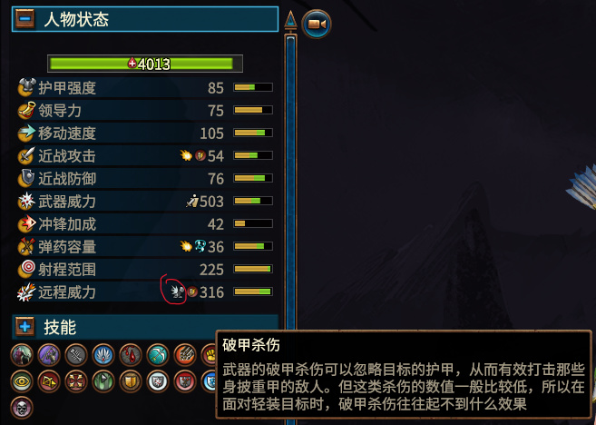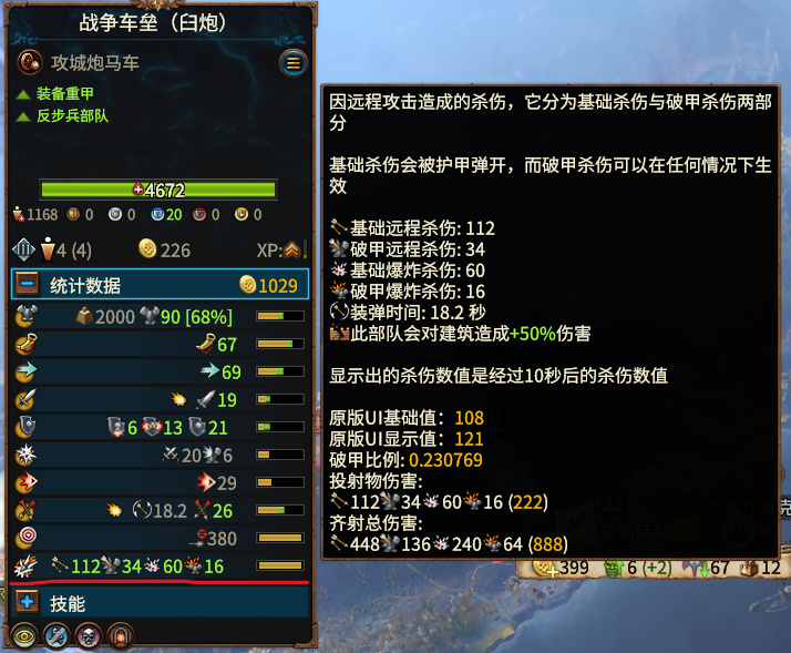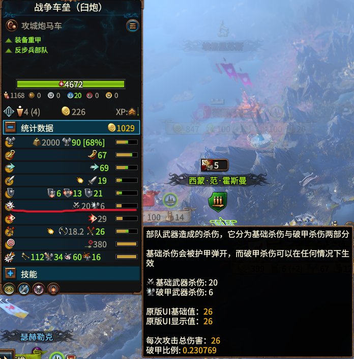 杀伤分为近战的(基础武器杀伤,破甲武器杀伤)和远程的(基础远程杀伤,破甲远程杀伤,炮之类的有的还带爆炸杀伤)。爆炸杀伤和法术杀伤也分破甲和非破甲,这里就不展开讨论了,只讲兵牌面板的。