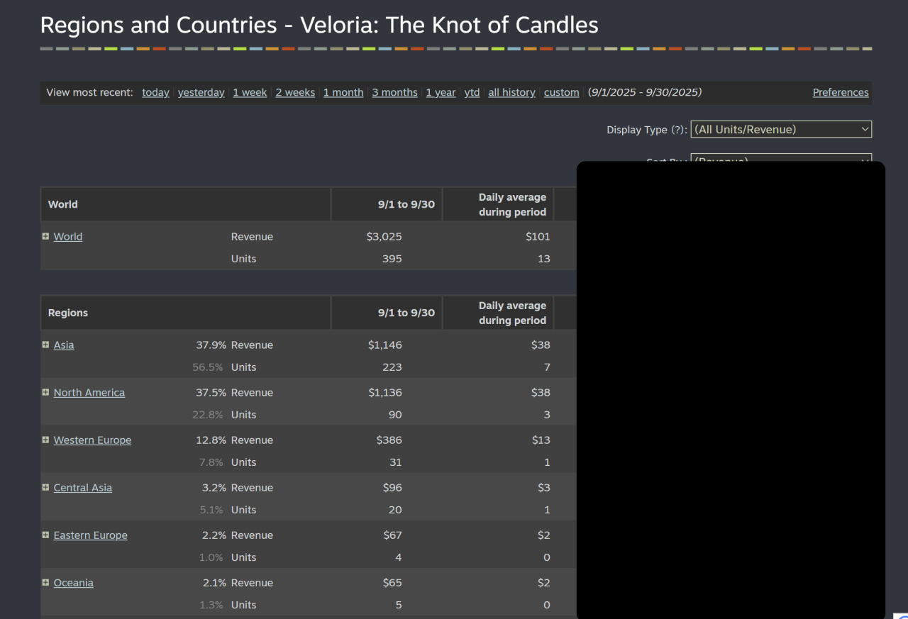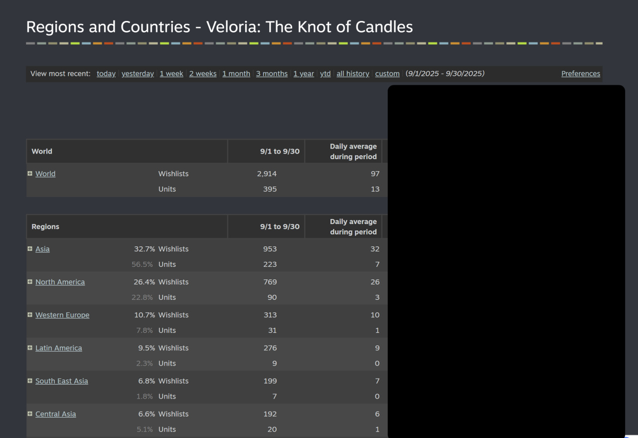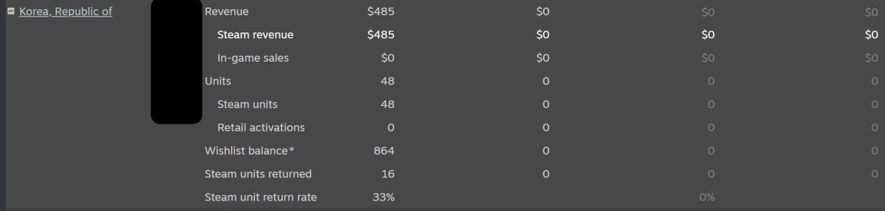 二改:關於願望單轉化,本遊戲願望單轉化最高的是巴西區,因爲巴西區一共只有100多願望單所以沒有討論價值。超過幾千份願望單的區裏國區轉化率最高,國區願望單隻有11,006,銷量卻超過了2000份,感謝國內玩家謝謝,燭花製作組後續遊戲國區也將是最低價。