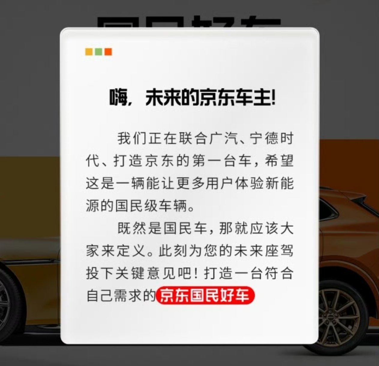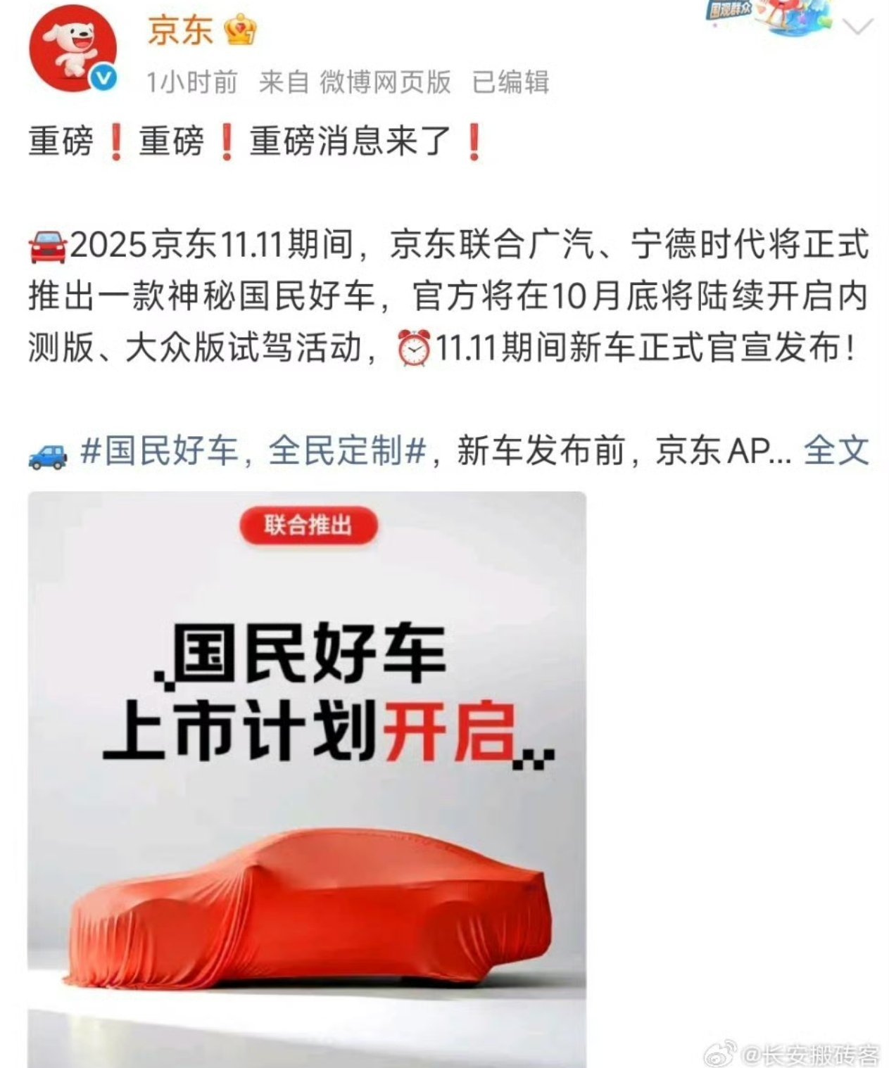 京东汽车10月14日宣布,将联合宁德时代旗下的时代电服和广汽集团共同推出一款“国民好车”。该车将于京东11.11期间正式发布,并在京东平台上独家销售。