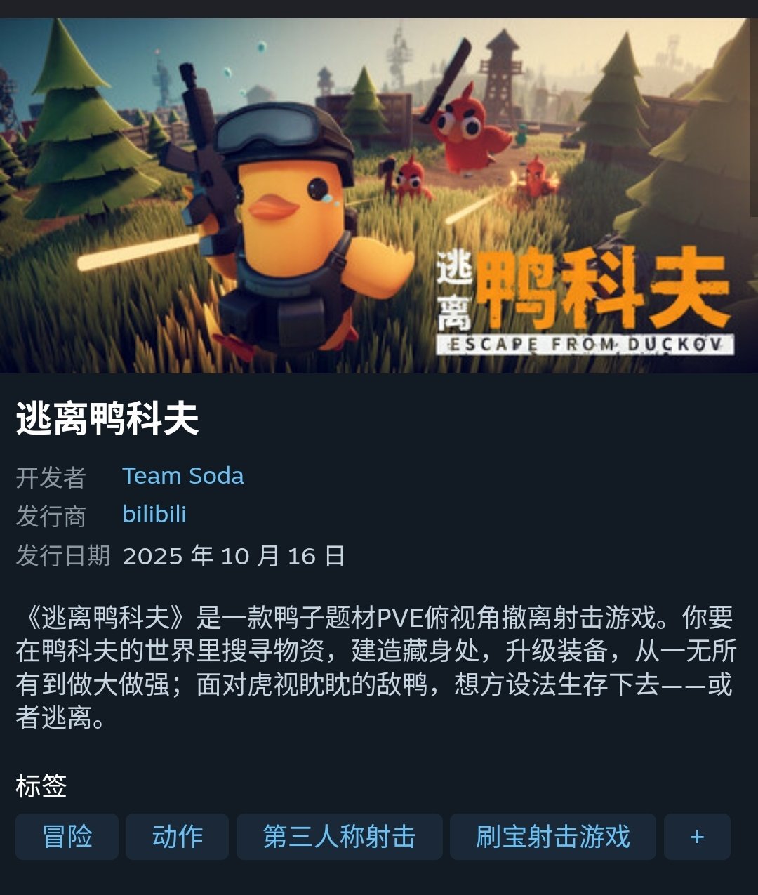 一款鴨子題材PVE俯視角撤離射擊遊戲。你要在鴨科夫的世界裏搜尋物資,建造藏身處,升級裝備,從一無所有到做大做強;面對虎視眈眈的敵鴨,想方設法生存下去——或者逃離。