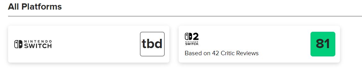 Metacritic(Switch 2端收录42家媒体评分,Metascore81分)