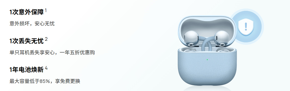 1 年电池焕新:当左/右耳机、充电盒电池最大容量低于85%时,可免费更换该部件,具体情况以华为客户服务中心检测为准。