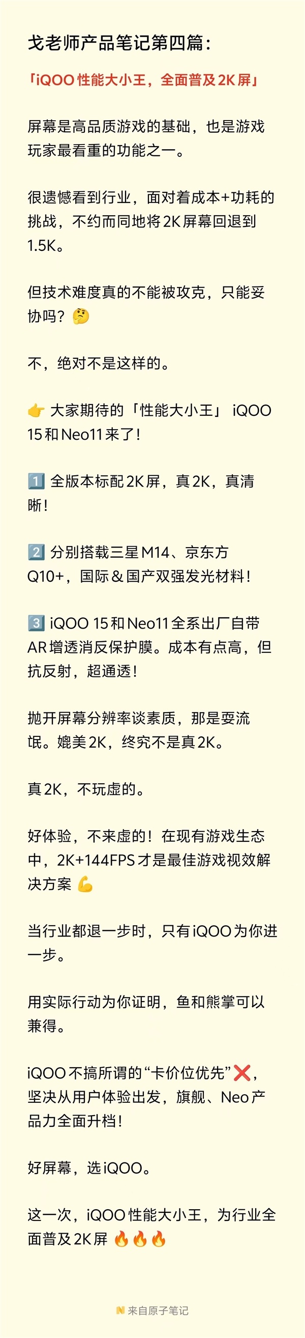 iQOO产品经理戈蓝表示,iQOO Neo11全系出厂自带AR增透消反保护膜,成本有点高,但抗反射,超通透。
