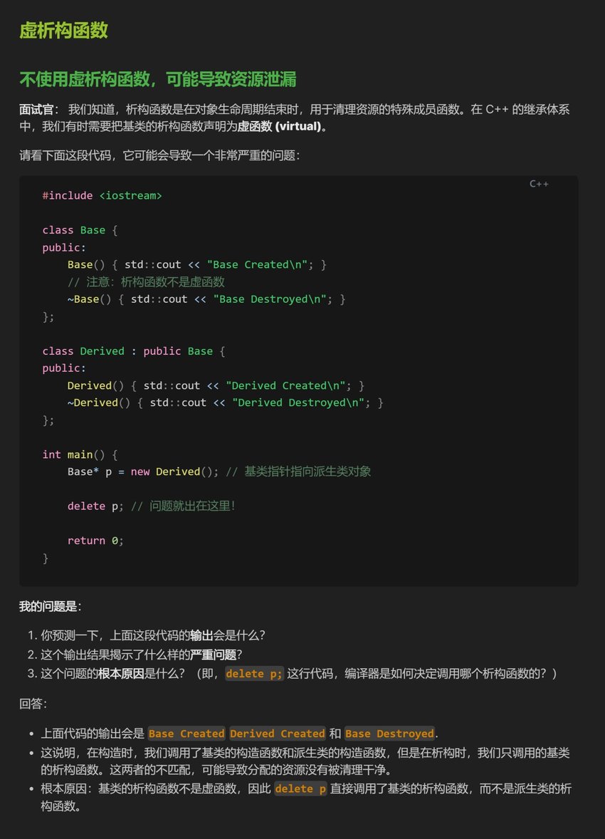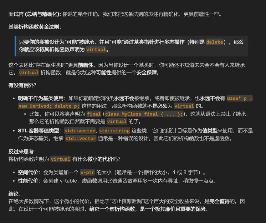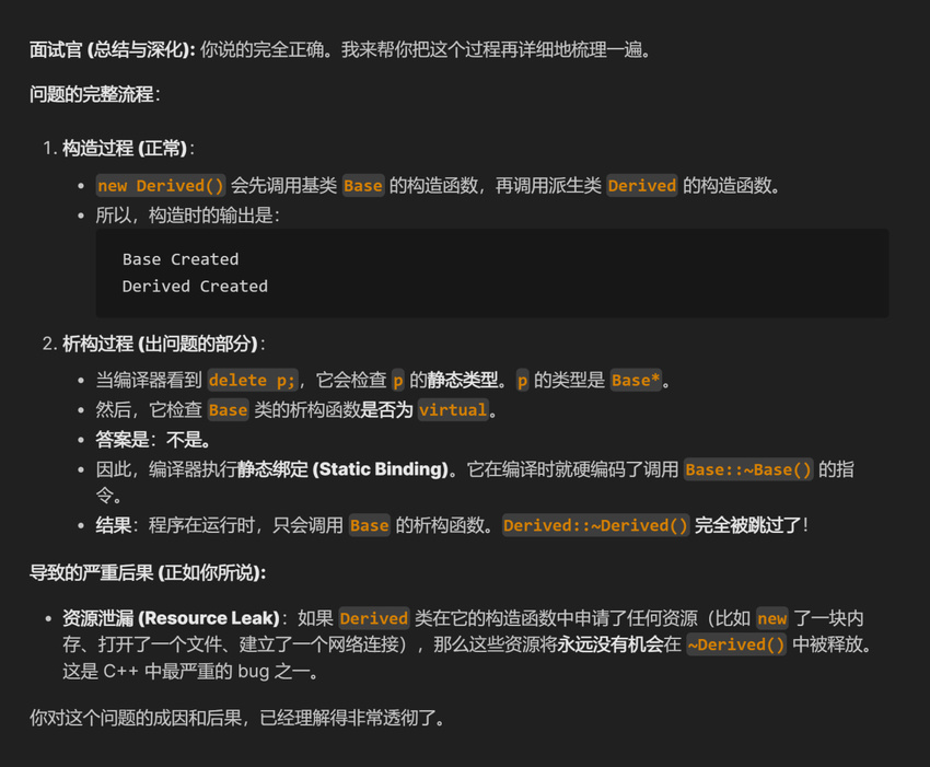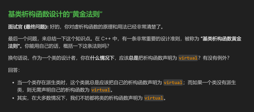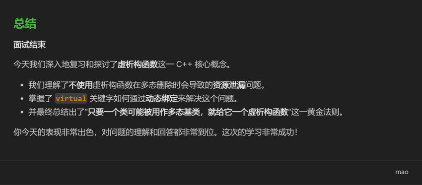- 我們理解了不使用虛析構函數在多態刪除時會導致的資源泄漏問題。