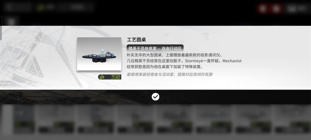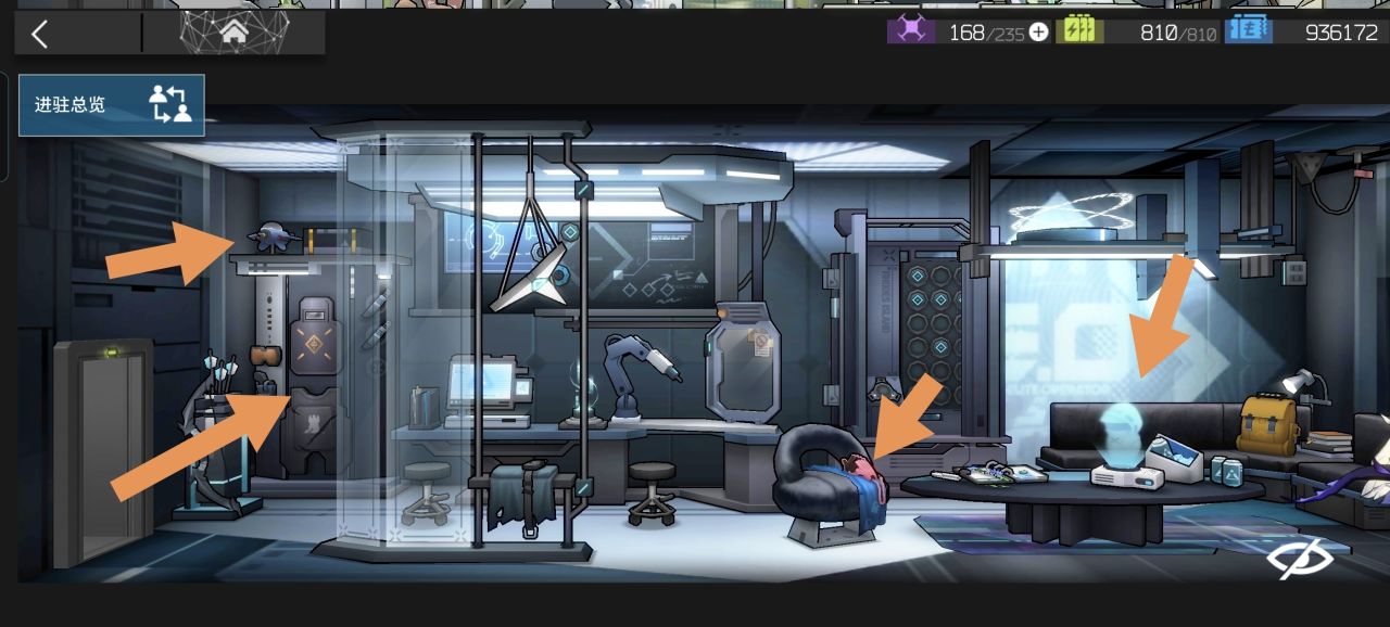 ⑤左上角擺放着電弧的小飛機,沙發上放着電弧的手套,以及這張圓桌上的投影通訊儀投影出來的淺藍色可愛mini博士,還有精英幹員們最愛玩的圓凳競速賽的小圓凳等