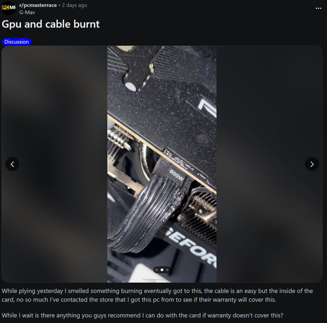 https://www.reddit.com/r/pcmasterrace/comments/1o4y1ie/gpu_and_cable_burnt/ 显卡和线都烧了