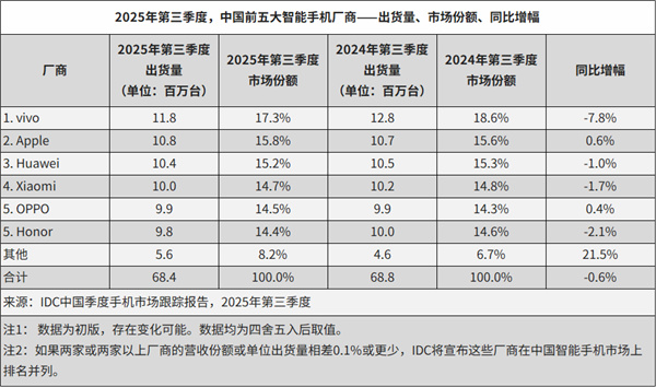 据IDC中国季度手机市场跟踪报告显示,2025年Q3中国智能手机总出货量为6840万台,同比下降0.6%,市场整体增长乏力。