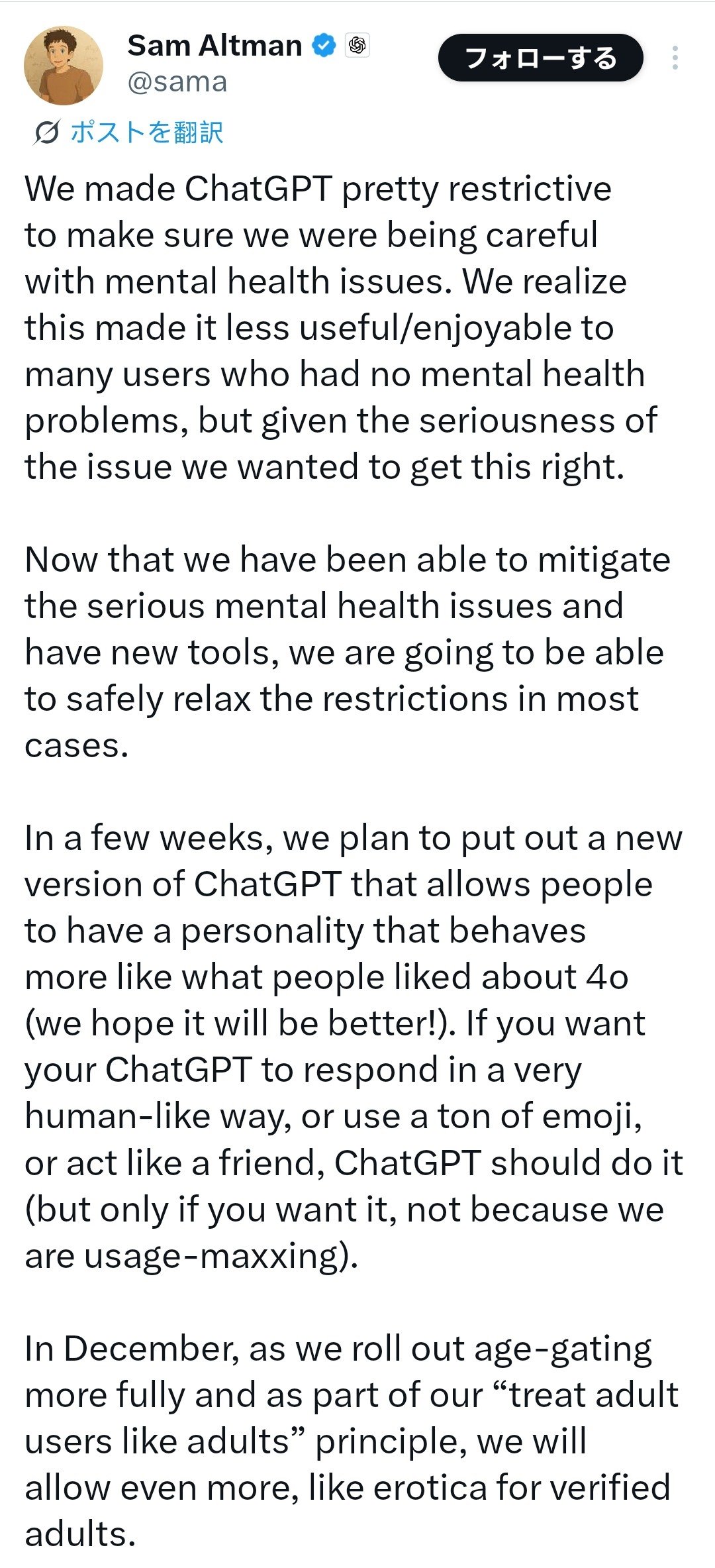 我們之前對ChatGPT設置了較多限制,以確保能謹慎處理心理健康問題。我們知道這讓許多沒有心理健康問題的用戶覺得不夠好用或有趣,但鑑於問題的重要性,我們必須謹慎處理。