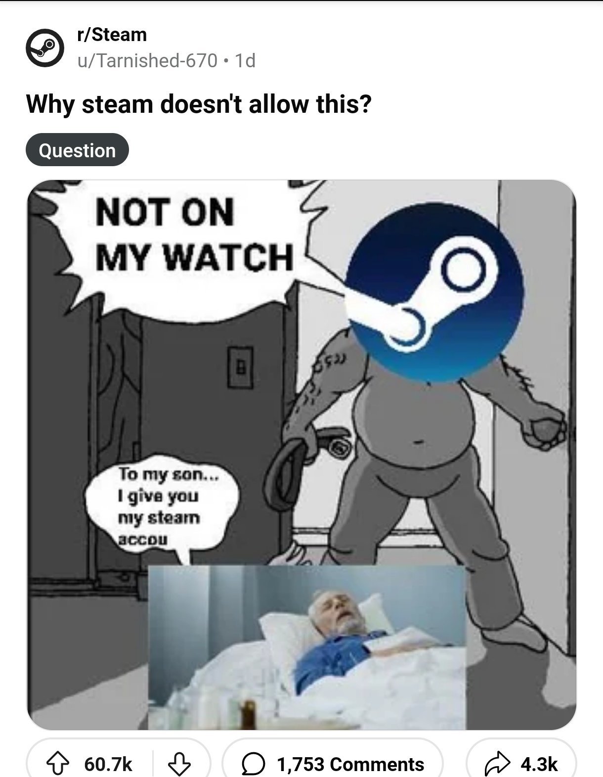 标题:《为什么Steam不允许这种操作?》▩ 上半部(蒸汽人形象)「想都别想!)▩ 下半部(病榻老人):「儿啊…我把Steam账号传给你…」