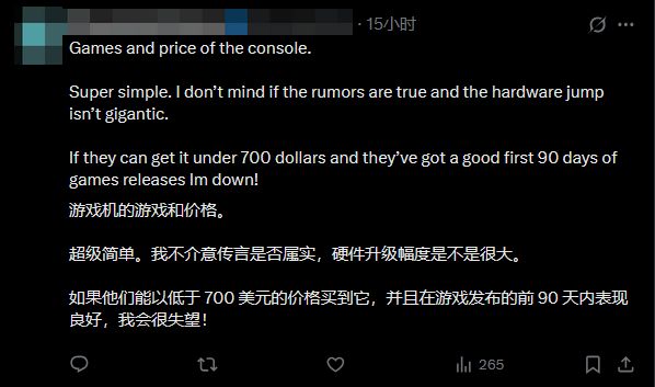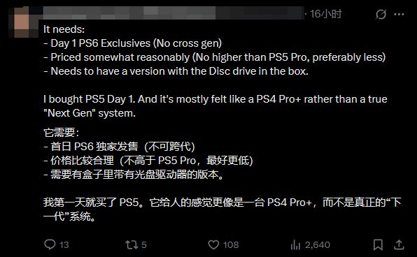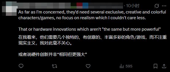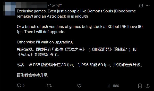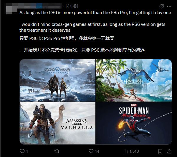 性能派:一部分玩家認爲主機的硬件性能仍是首要因素,尤其關注圖形、幀率、加載速度和對大型開放世界/多人在線遊戲的支持能力。許多人表示如果性能顯著提升,他們更傾向於首發購買。