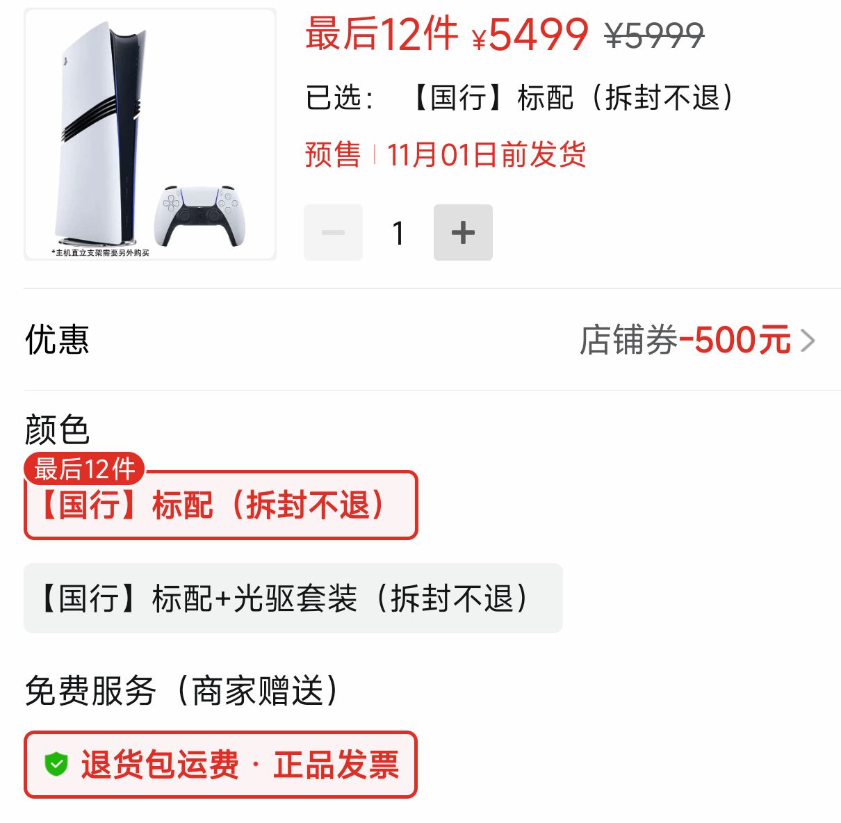 该店铺预售标价为5999元,消费者可领取500元无门槛优惠券,券后实际价格为5499元。一位电玩店老板透露,其进货成本约为4999元,因此他预计零售价在5199元至5299元之间。他表示,国行版主要优势在于提供本地保修服务,价格相比海外版并无明显优势。作为对比,日版PS5 Pro在拼多多平台的史低价为4599元,近期售价在4699至4799元区间。
