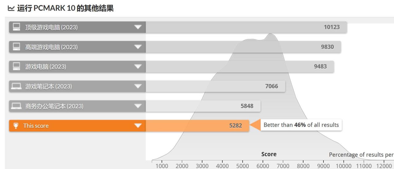在PCMARK 10的在線結果評比中,對比其他參與測試的高性能電腦,這臺迷你主機的得分好過46%的機型,與之相似的高端商務辦公筆記本(i7-1360P處理器,售價6780港幣)得分僅比它多了10%。