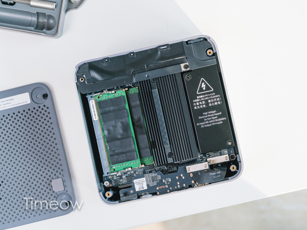 拆下底蓋後,就可以看見內部結構了,可見部分包含內存、SSD散熱器、內置電源、以及WiFi天線板。