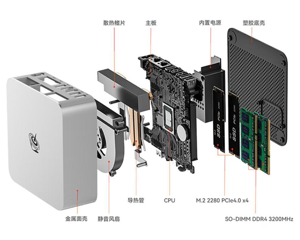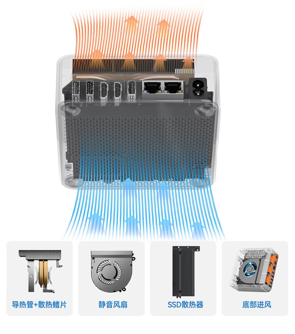 零刻EQi13 Pro現在用上了自研的MSC2.0熱處理系統,通過高效率的導熱管和散熱鰭片將核心的熱量快速攤開,接着,通過大尺寸的靜音風扇再把熱風排出去: