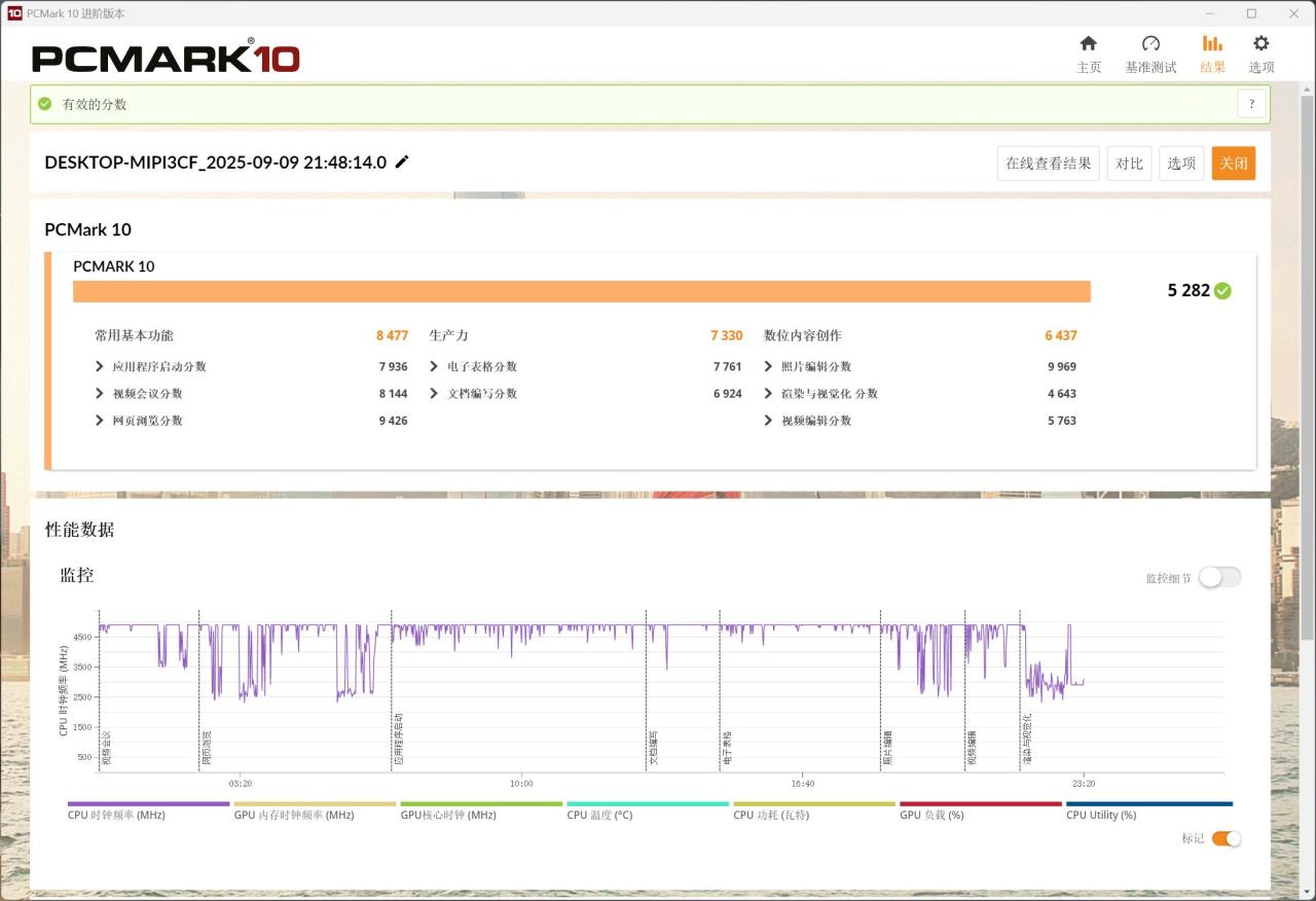 PCMARK 10測試了整機的生產力性能,包含office辦公、圖片處理、視頻會議等項目,對了解整機的持續性能釋放有較高的參考價值,零刻EQi13 Pro綜合得分爲5282分。