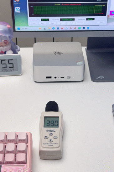 此時,CPU滿載的情況下,分貝儀顯示噪音僅爲39分貝左右。