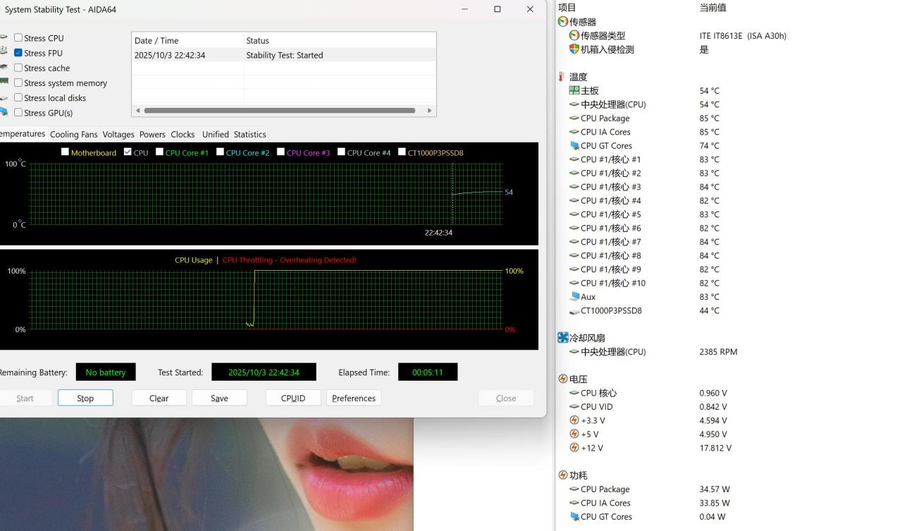 實測在AIDA烤機時,內部核心溫度最高才85攝氏度,距離傳統的95度高溫牆還有很遠的距離,而且CPU功率非常穩定,沒有出現過熱降頻的問題(過熱降頻的紅線一直都在最底下,保持着0%)。