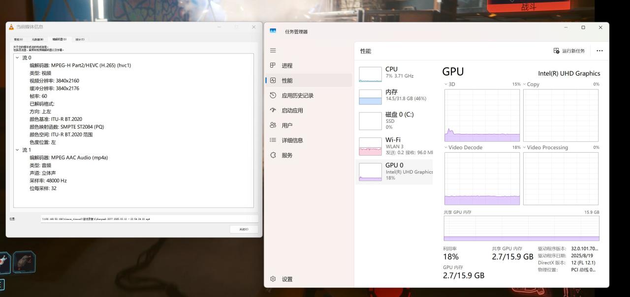 我使用VLC播放器,播放一段HEVC格式的4K分辨率自錄遊戲視頻。