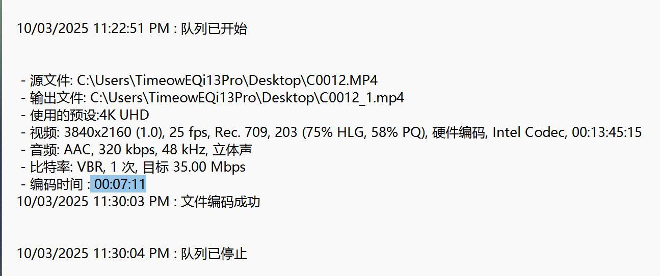 接着來看一下視頻轉碼,使用Adobe Media Encoder 2025對一個用索尼A7R2拍攝的、13分多鐘、H264格式、100Mbps的4K視頻轉碼,目標格式爲H265(HEVC)、35Mbps、4K(預設4K UHD)。