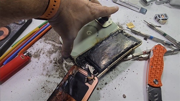 他在徒手掰谷歌Pixel 10 Pro Fold時,手機突然起火爆炸,這是他第一次遇到起火爆炸的機型,本人感到非常驚訝。這次谷歌Pixel 10 Pro Fold沒有通過耐久性測試,博主能徒手掰彎這款摺疊屏。