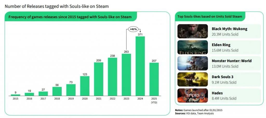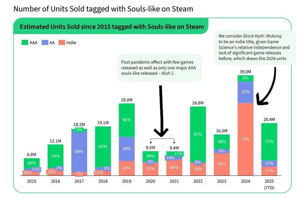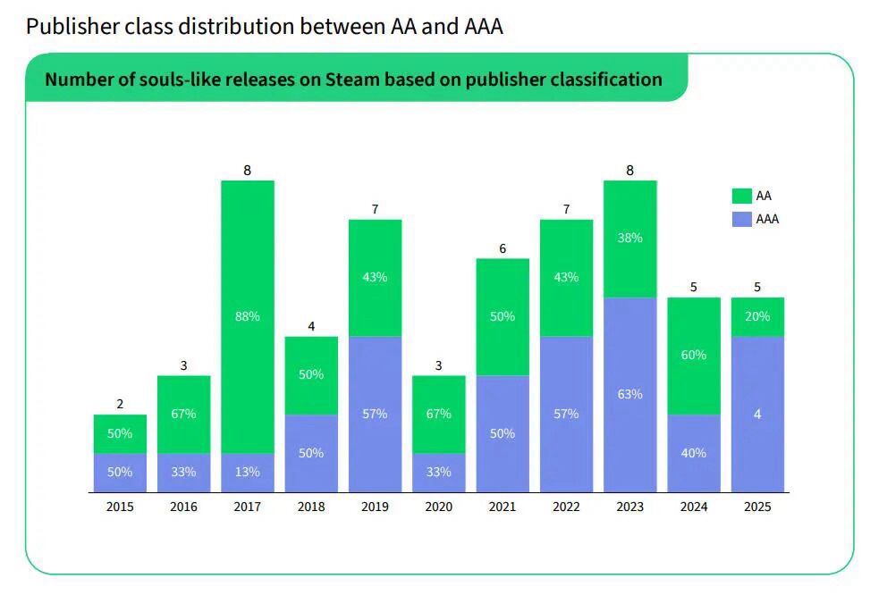 VGI指出,自2015年以来,Steam平台上类魂游戏的单位销量最初由3A级工作室主导,但在2017年“被2A级开发商抢占了市场份额”,之后又“迅速重新占据主导地位”。3A大作在2024年的销量占比接近四分之三,到2025年这一比例增长至70%。