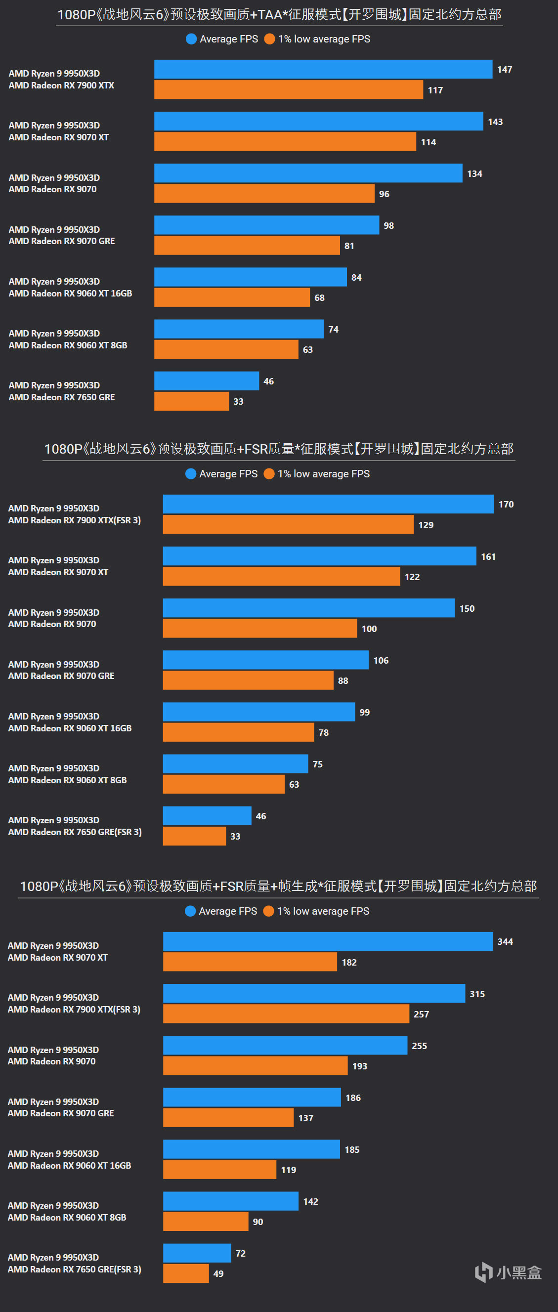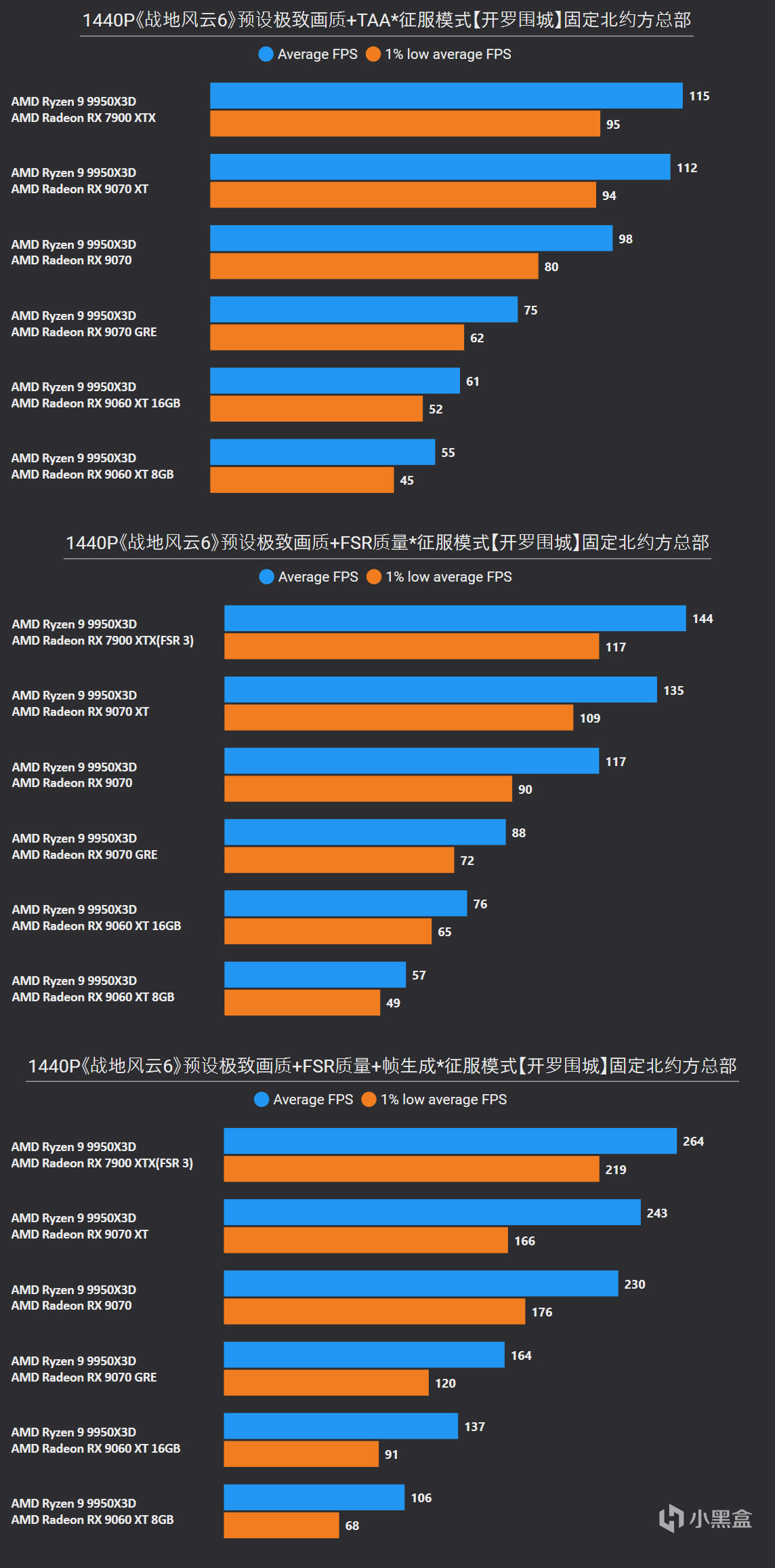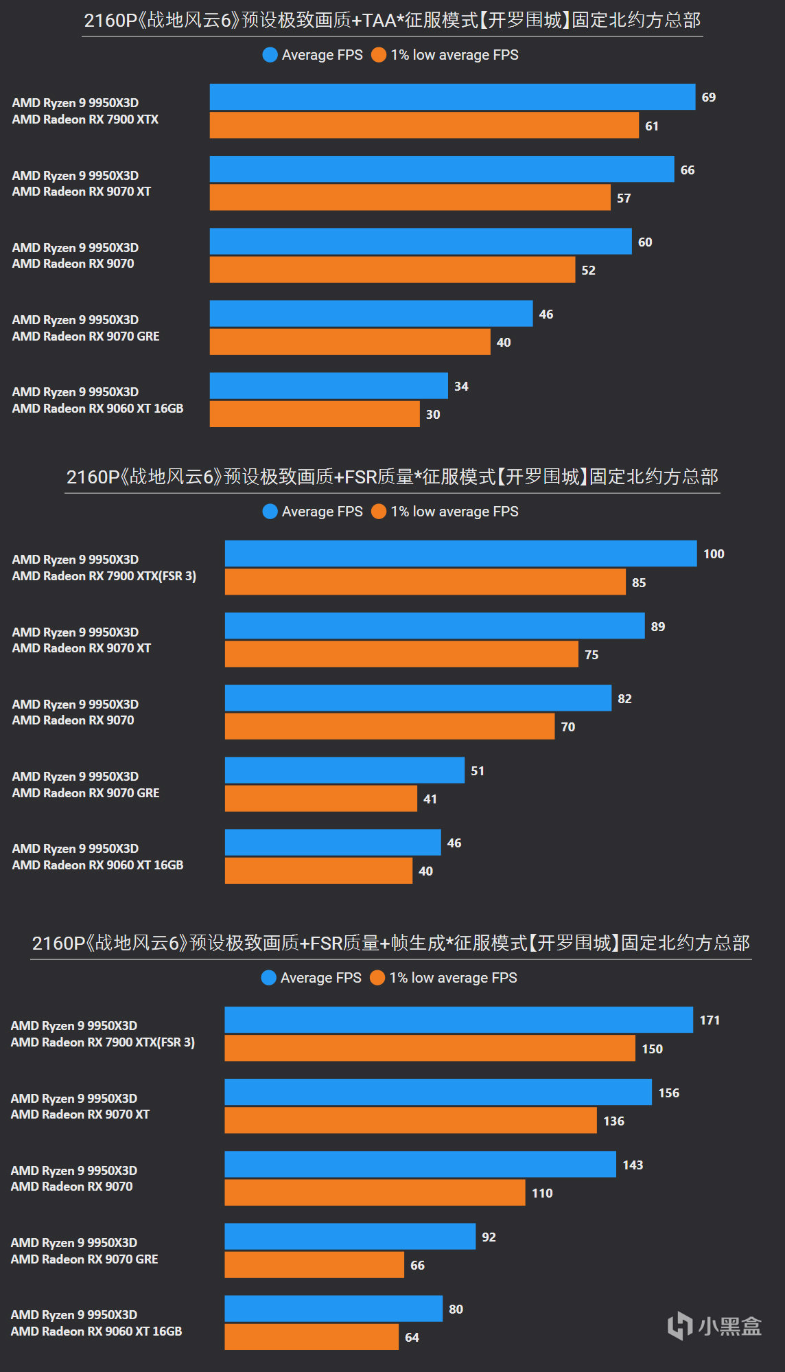 高刷標準方面,看個人是想搭配TAA還是FSR,TAA就建議RX 9070級別,FSR則是降一檔RX 9070 GRE即可。至於RX 9070 XT和RX 7900 XTX兩者對比,後者大多情況性能更強,看來《戰地6》確實是充分發揮了顯卡的光柵性能。