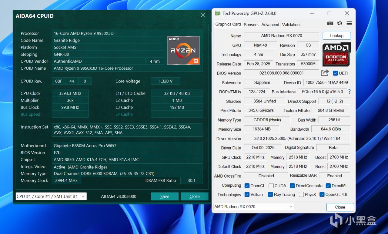 主板是技嘉B850M電競雕,搭配兩根DDR5 6000C26 16*2內存套裝,操作系統是Windows 24H2最新版本,搭載顯卡驅動是AMD Adrenalin 25.10.1 Preview預覽版,針對《戰地6》有優化支持。