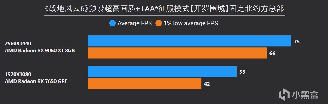 設置成超高畫質後,2K分辨率下RX 9060 XT 8GB平均幀率達到了75fps,相比極致畫質提升了23%,1% LOW幀也穩過60fps,完全可以放心流暢玩耍了。而對於RX 7650 GRE,降低畫質後它在1080P分辨率也能達到平均55fps,估摸再降一個特效就可以穩過60fps。